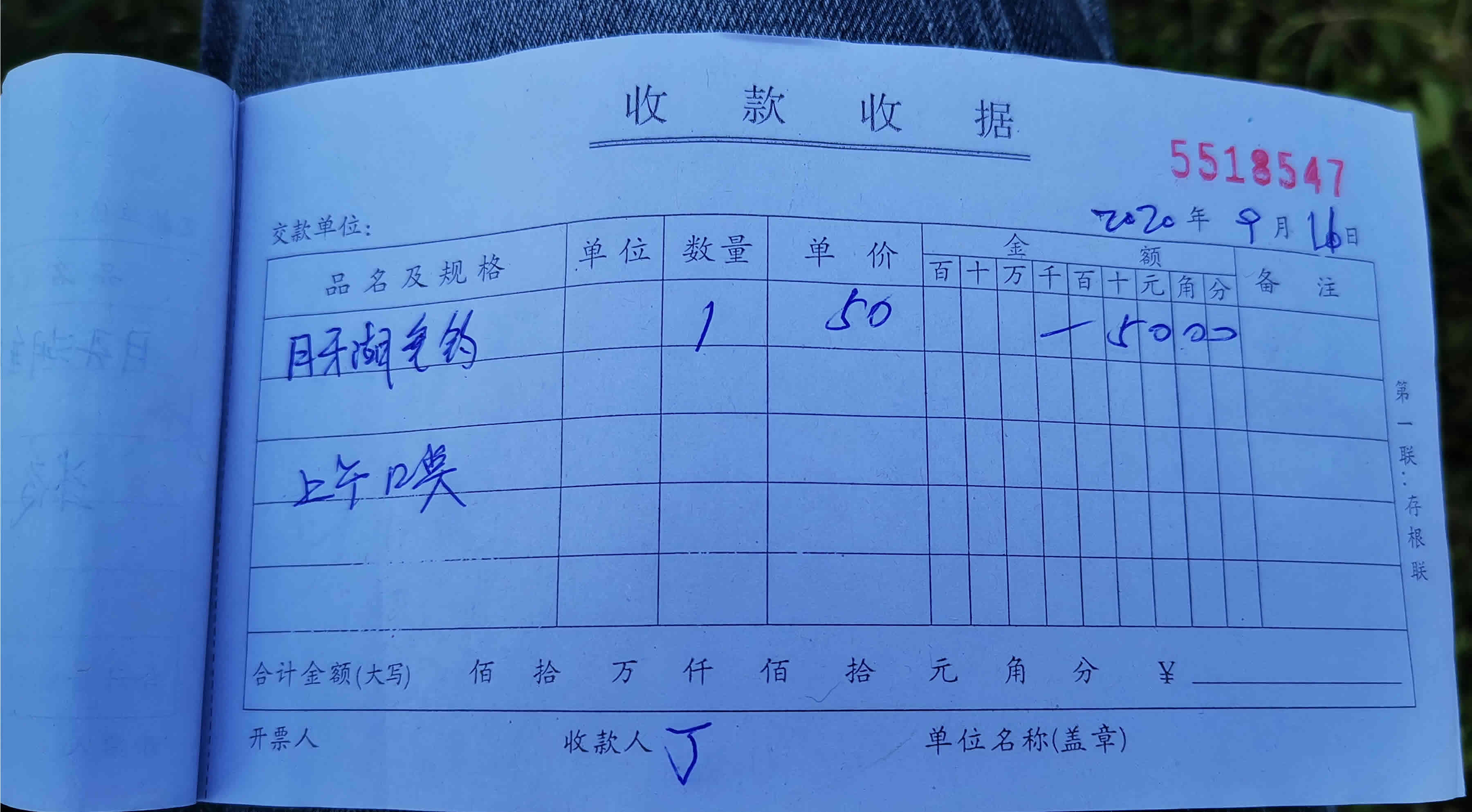 [size=6]2020年9月11日上午,本人在南京路月牙湖钓鱼,一位50岁左右的人手拿一本收据,要求收费100元,钓半天50元,该收据没有收费单位盖章。附近也没有收费标准和价格批准公示。此人表示是“小王庄”村委收的,月牙湖是当地村里挖的,不交费就收杆走人。