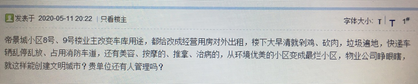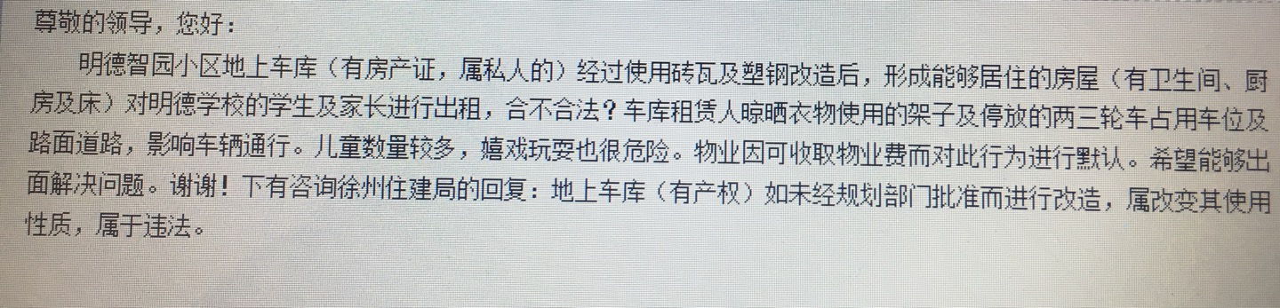 现反映以下几个小区[color=Red]违法改变房屋性质[/color]后,进行租赁及经商:[color=Red]东方帝景城小区[/color]、[color=Red]明德智园小区[/color]、[color=Red]世纪花园小区[/color]。