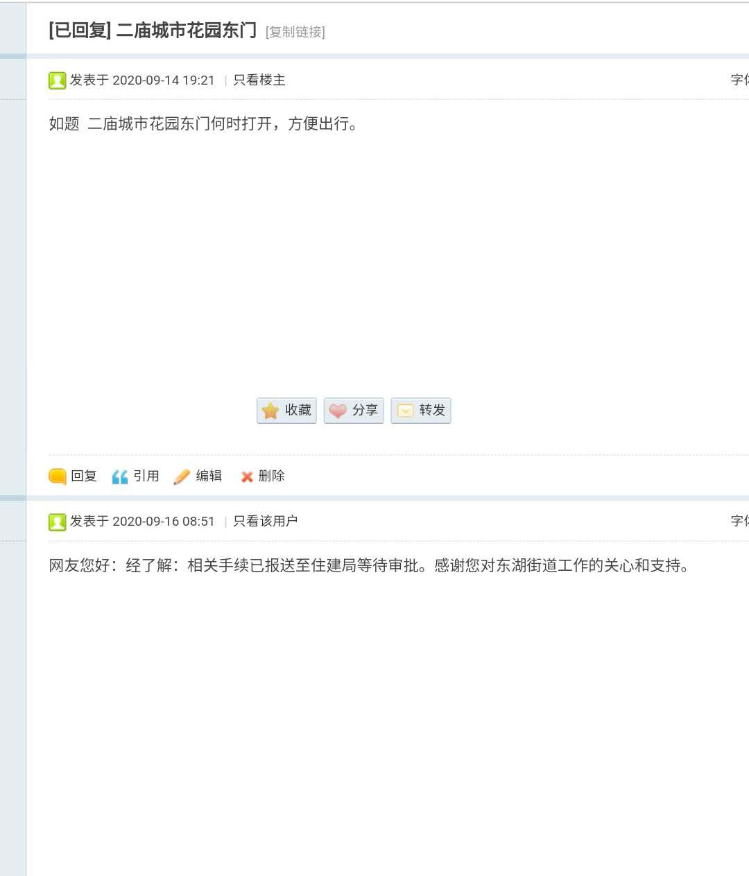 如图,经住建局回复 二庙城市花园东门已于2020年5月21日同意建设。为何至今没有实施。如今南门已不堪重负,望尽快打开。