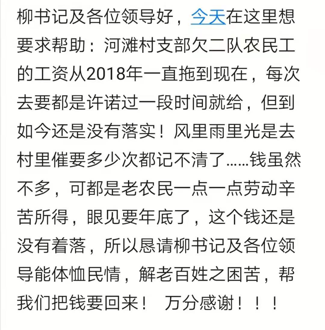 对于你反映的问题,经与河口村委会核实,你所说的农民工工资,其实是村里组织村庄环境整治时欠的人工费。目前,村里正在筹措资金,近期给予兑付。如有疑问,请与河口村书记刘恒联系,手机18118589666.