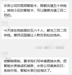 不知道相关的领导知不知道,自来水公司对于惠民花园业主充值水费,有价格歧视:只允许充值不足50元,多了不给充,用完再来充。
