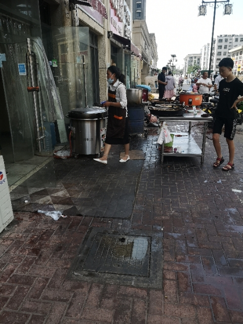 邳州市汇川大象城东区商铺包记牛肉煎包早点占道经营,占用公共道路摆摊,使用鼓风机烧炭作业,油烟灰尘污染严重,满地都是油渍污水,墙壁都是油渍,投诉也一直没有解决占道经营和油污