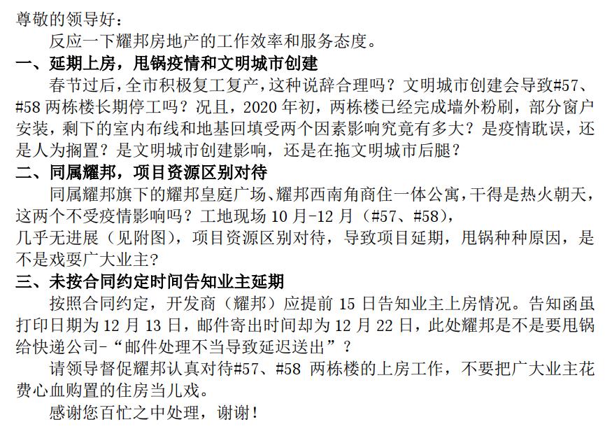 请领导督促耀邦认真对待#57、#58两栋楼的上房工作,不要把广大业主花费心血购置的住房当儿戏。