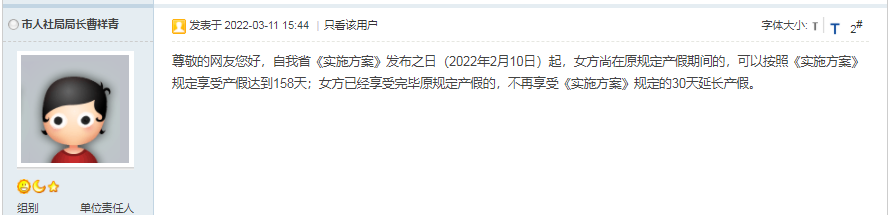 尊领的局领导您好,根据江苏省出台的《关于优化生育政策促进人口长期均衡发展实施方案》文件精神,我省女职工产假已延长至158天。我市人社部门也对此亦有相应答复(见下图)。请问领导,我局是否已按文件精神执行了这一政策。盼复。